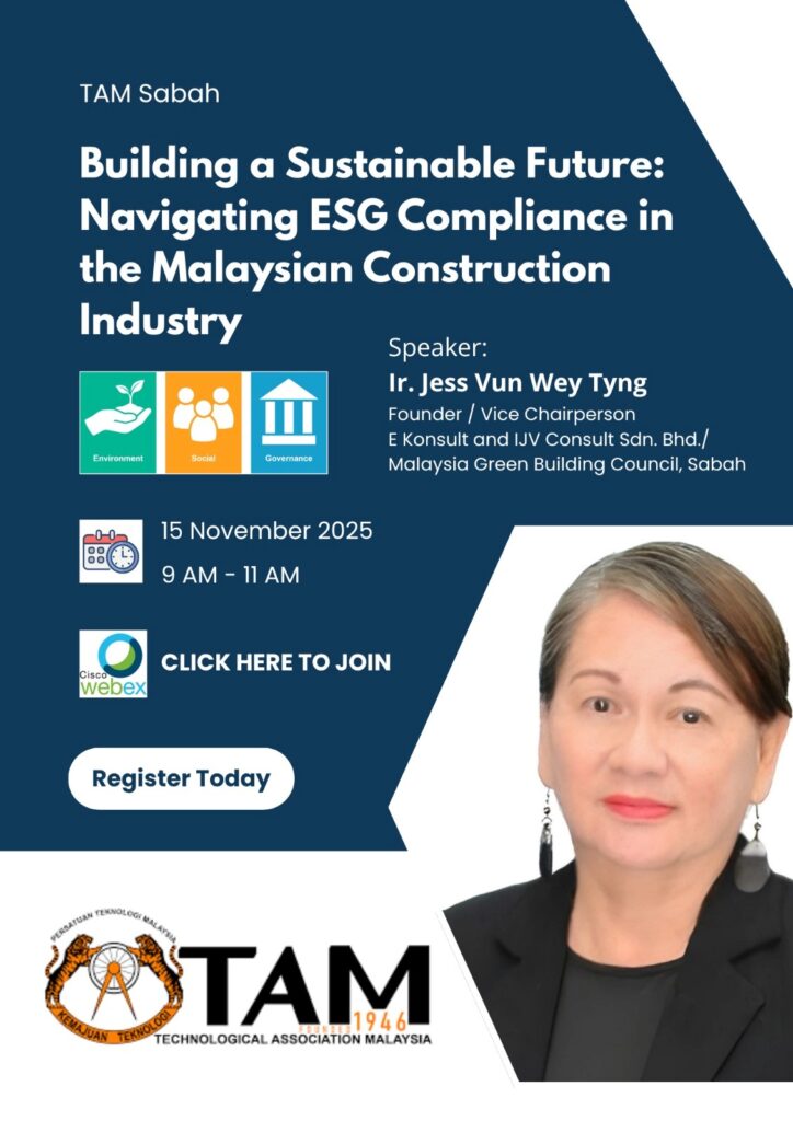 Join us for an insightful session on Building a Sustainable Future: Navigating ESG Compliance in the Malaysian Construction Industry 🌏 🗓 15 November 2025 (Sat) ⏰ 9.00 AM – 11.00 AM 📍 Online (Webex) https://ums-edu-my.webex.com/ums-edu-my/j.php?MTID=m549dafcb730165ce6db613bc89f28321 🎟 Register Here: https://forms.gle/RWezvZiw2L2fUAdG8 Abstract: The Malaysian construction industry faces a paradigm shift as Environmental, Social, and Governance (ESG) considerations move […]